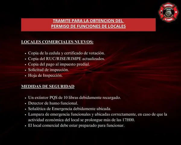 El cuerpo de Bomberos del Cantón El Tambo informa a la ciudadanía acercarse a nuestra institución para solicitar la inspección de locales comerciales para que puedan obtener los permisos de funcionamiento