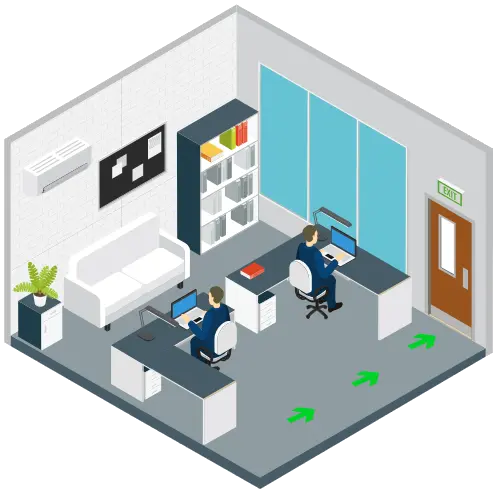 Salas de reunión con aforo menor a 50 personas, oficinas gubernamentales o públicas, oficinas privadas, oficinas técnicas, laboratorios educacionales, consultorios médicos y odontológicos, clínicas para pacientes ambulatorios, universidades y entidades bancarias